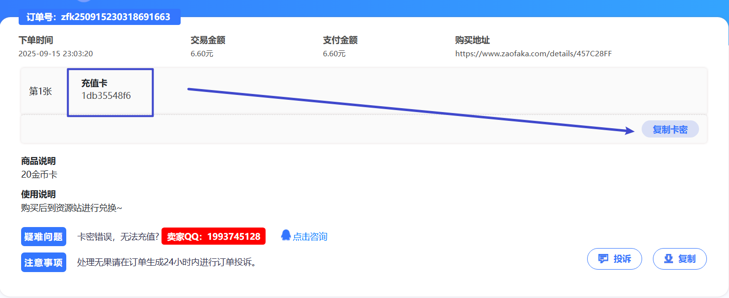 购买成功后,请复制卡密,到【个人中心下方-金币兑换】进行兑换;